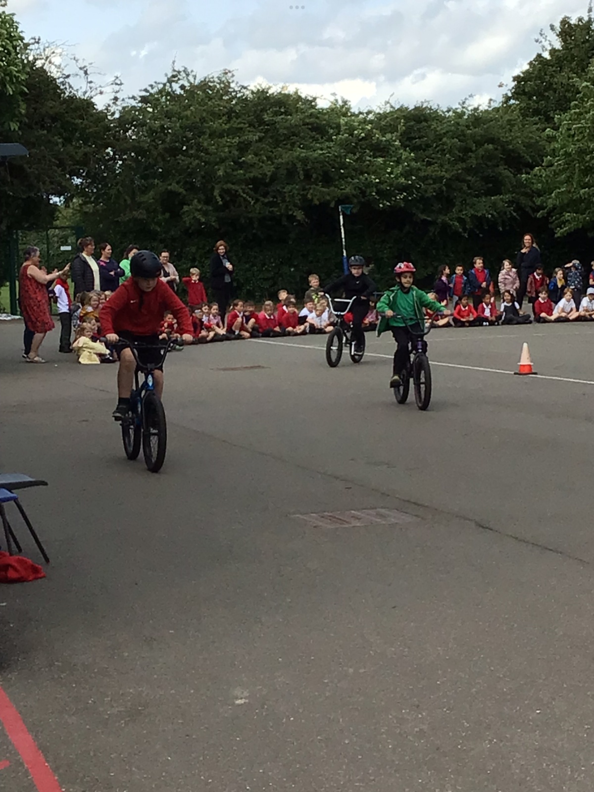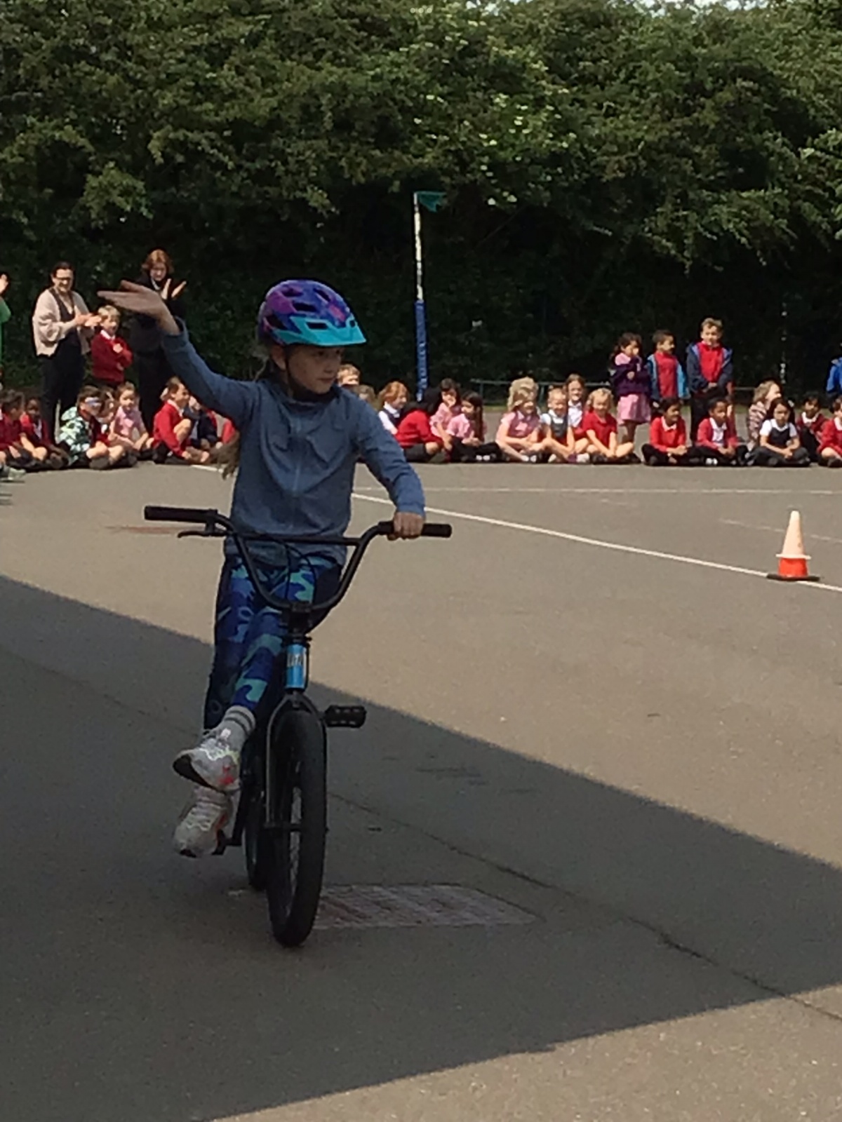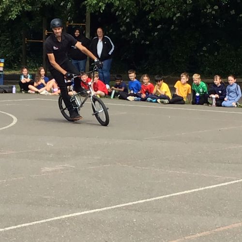 A very different approach to riding a bike for the Year 5s, after their on-road training ! Ex World Champion Mike Mullen, was clear to emphasise that the tricks were not for the road...